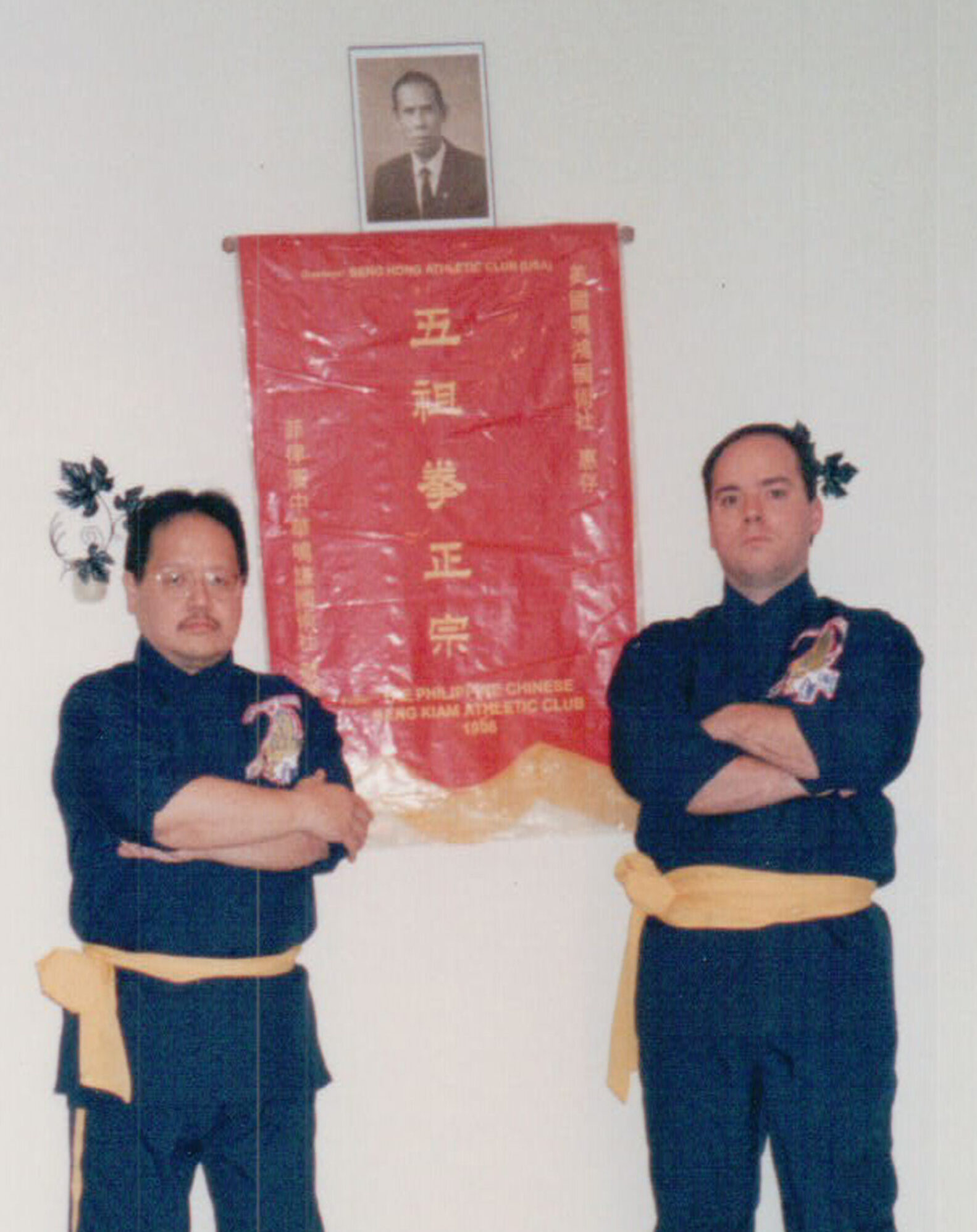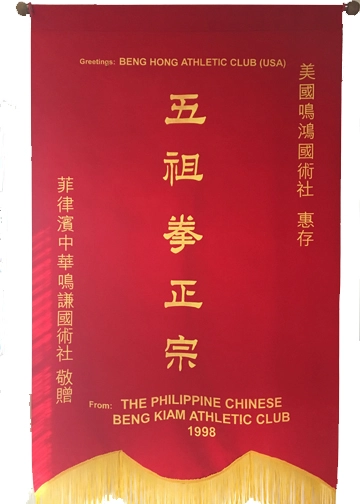 Alex Co was another of Tan Ka Hong’s outstanding disciples. And he nearly single-handedly kept the teaching and promotions at Beng Kiam alive for decades. Alex Co had an outstanding disciple named Mark Wiley, who also studied with Sifu Benito Tan and Hua Kun). In 1998 Co Sifu gave Wiley permission to open a Ngo Cho club in America to spread the teachings of Beng Kiam. Co and Tan named the club Beng Hong (in honor of Chua Giok BENG and Tan Ka HONG). In 1998 Co came to the USA to launch the club with Wiley and presented him an official banner of recognition from Beng Kiam to the newly formed American Beng Hong Martial Arts Society (美國鳴鴻國術社).