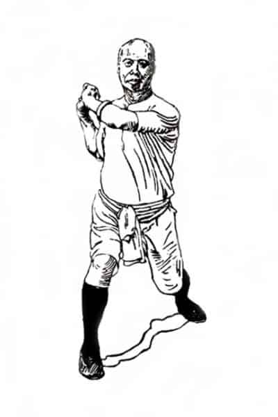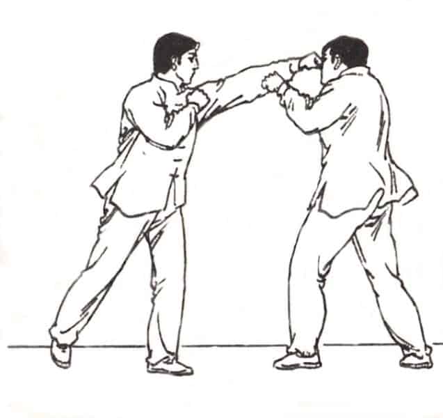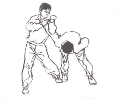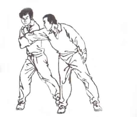 All seizing and throwing methods are based upon the use of fulcrums. For example, a popular posture/technique throughout Asian martial arts is the proverbial level fist in a bow footstep or horse footstep (马步/mǎbù). As stated before, it is obvious that it is a strike or one-dimensional technique, and we know it is also a grab within a two-dimensional plain, but within a third-dimensional reality it is a throw due to use of the bow footstep and the position of the torso. For example, in a two-dimensional plain we saw the emergence of the rear-leg going forward for a bump of the knee; now the raised leg can be converted from a bump to hooking the opponent’s leg to create a throw/trip. Also, there is the inclination of the torso, which creates two fulcrums: the back and the shoulder or rear-leg and shoulder. Either one of these combination will create a throw. [5A & 5B]